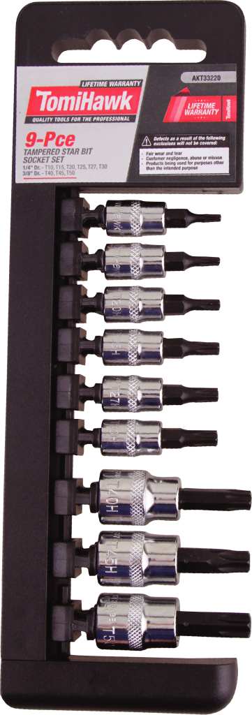 TOMIHAWK 1 4-3 8"DR TAMPER-PROOF STAR BIT SOCKET SET1 4" DR - T10. T15. T20. T25. T27. T30. 3/8" DR - T40. T45. T50 9 PIECE